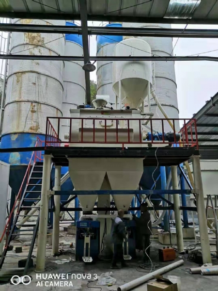該型號設(shè)備由原料倉、輸送螺旋、配料秤、斗式提升機、雙軸無重力混合機、主機平臺、成品倉、自動包裝機、除塵器等組成。主要用于生產(chǎn)石膏砂漿、抹灰石膏砂漿等產(chǎn)品。
